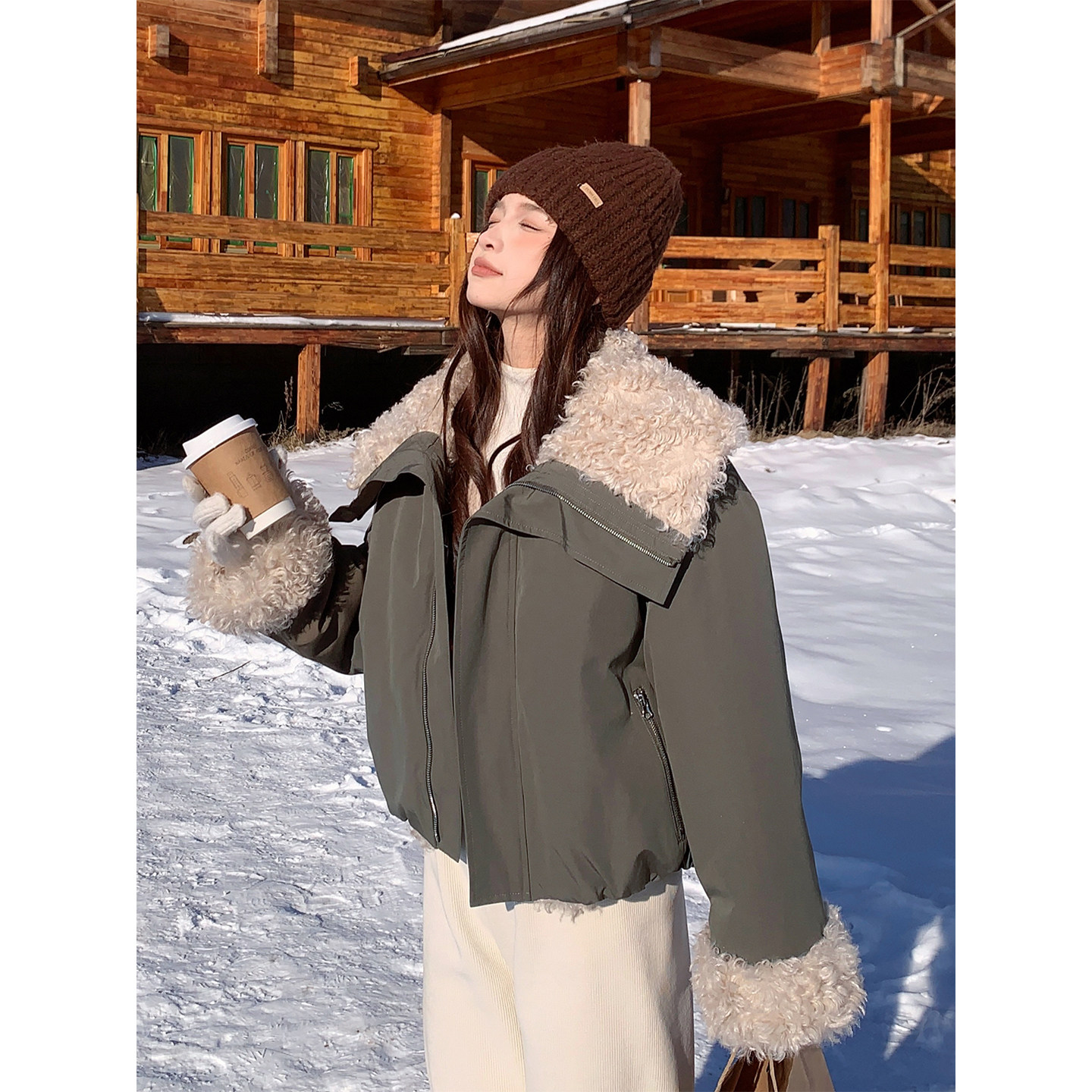 军绿色大翻领短款派克服羊羔毛外套女冬2025新款韩系加厚加绒棉服