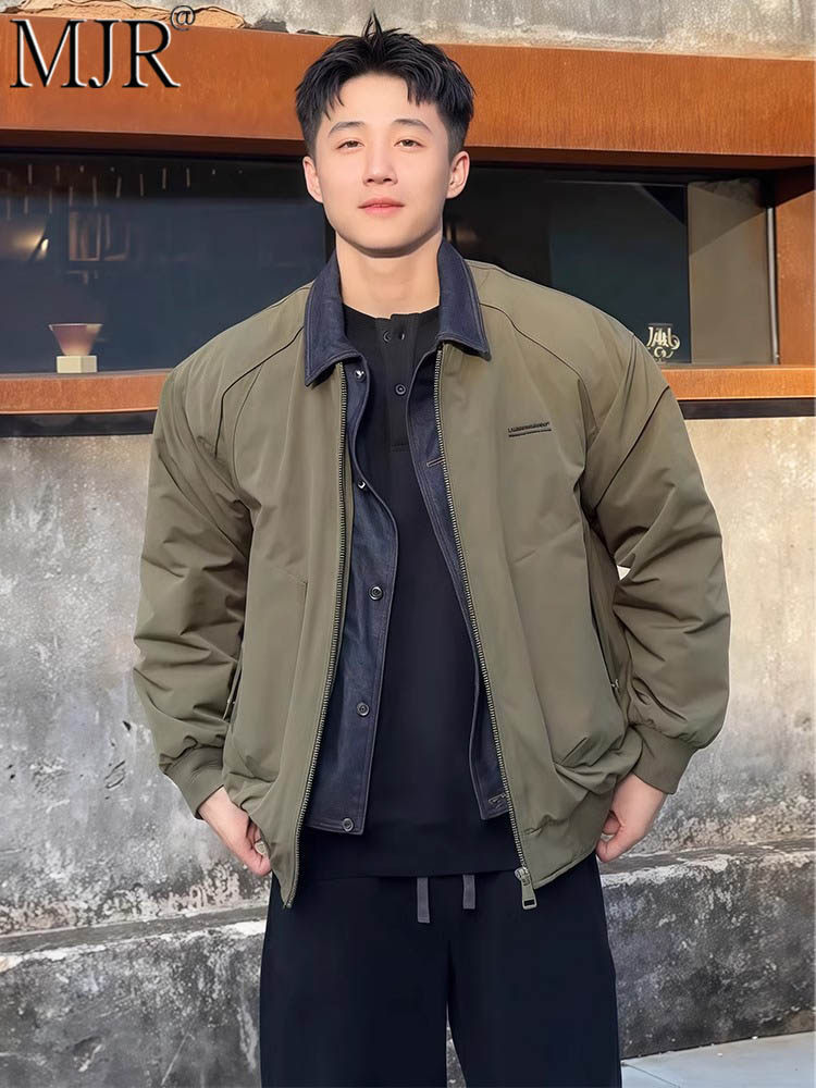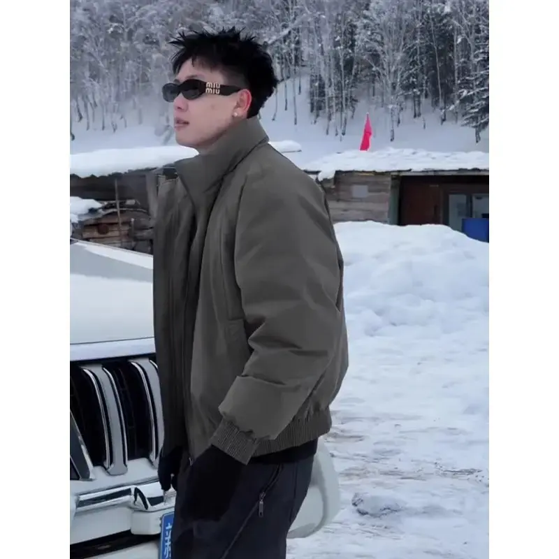 军绿色短款夹克棉服男潮牌冬季加厚美式覆古翻领工装棉衣时尚外套