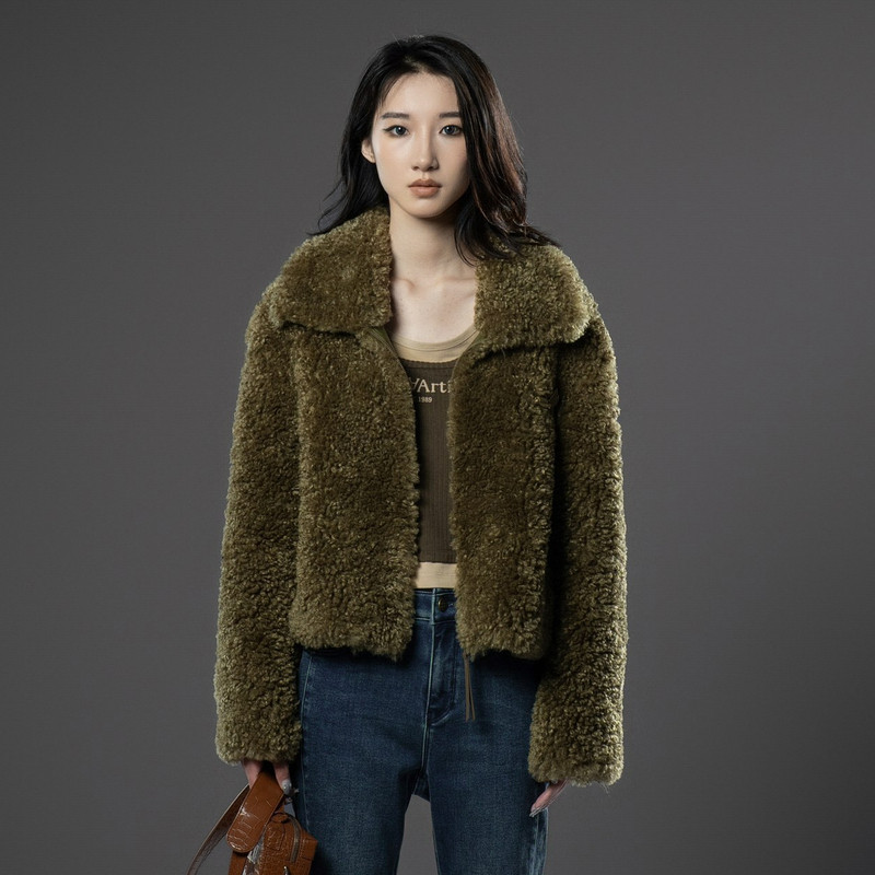 U/TI军绿色小卷毛短款外套女装百搭翻领休闲上衣尤缇2024冬季新款