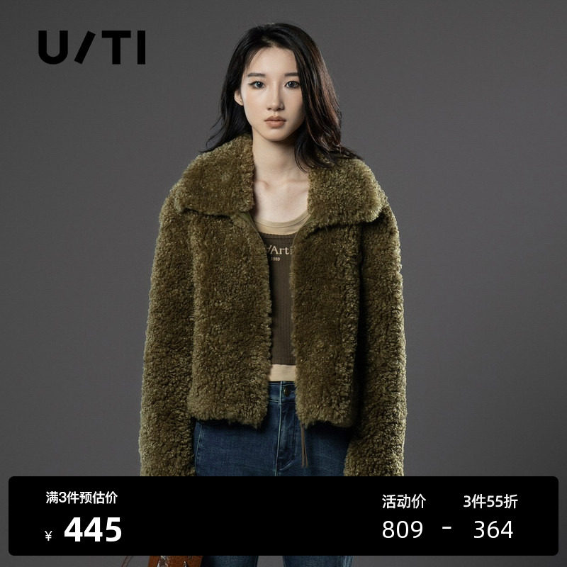 U/TI军绿色小卷毛短款外套女装百搭翻领休闲上衣尤缇时尚冬季新款