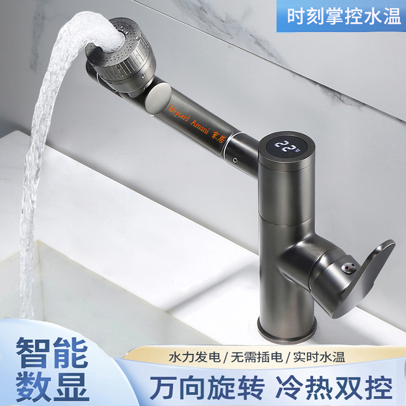 全铜数显面盆浴室柜水龙头台下盆单孔冷热枪灰色万向旋转卫浴龙头