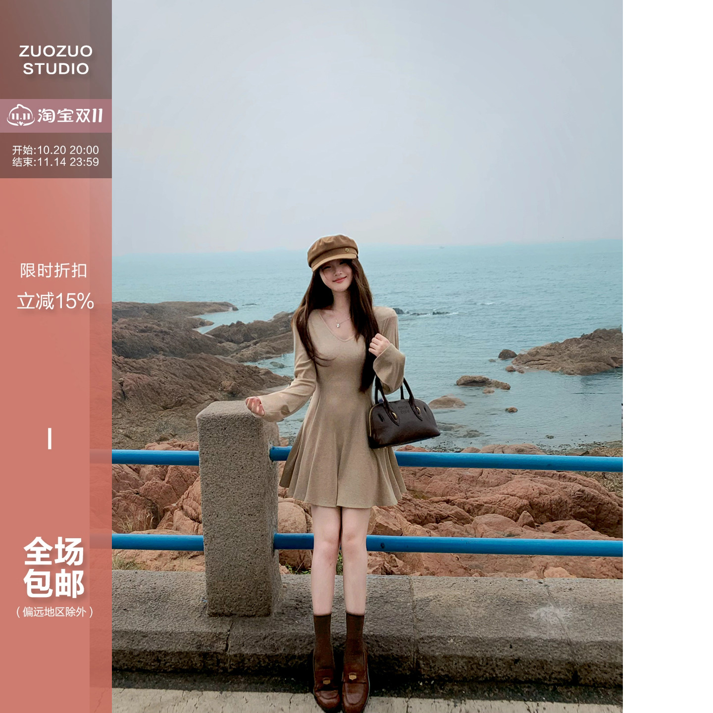 - 一字领连衣裙 秋 长袖