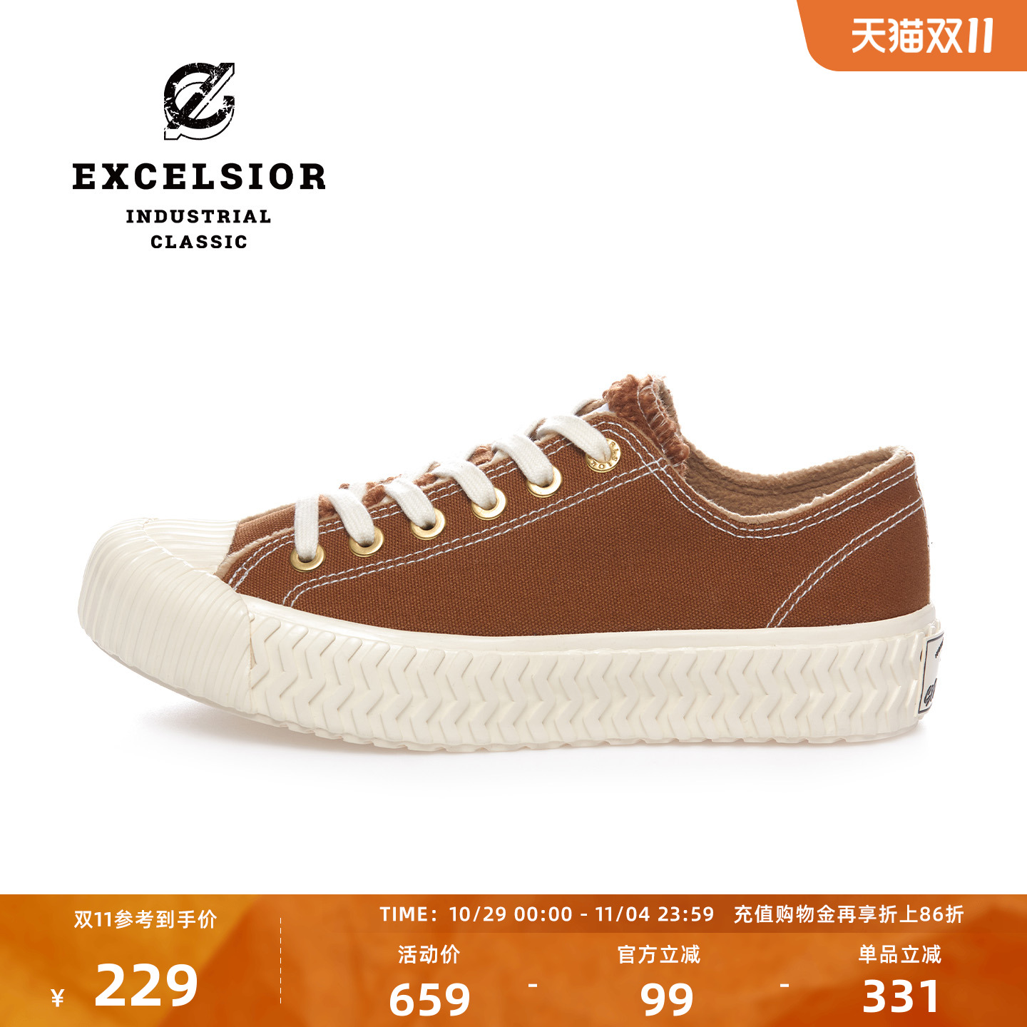 excelsior官方 秋冬棕色女鞋低帮休闲鞋增高板鞋厚底加绒帆布鞋男