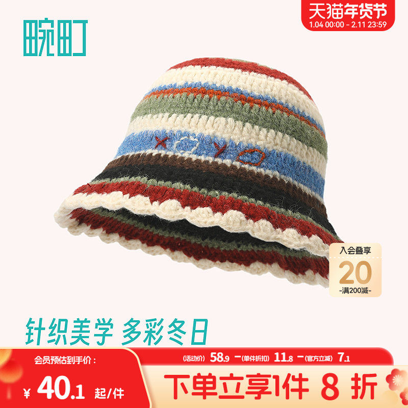 畹町复古针织帽女秋冬时尚撞色条纹渔夫帽含绵羊毛显脸小毛线盆帽