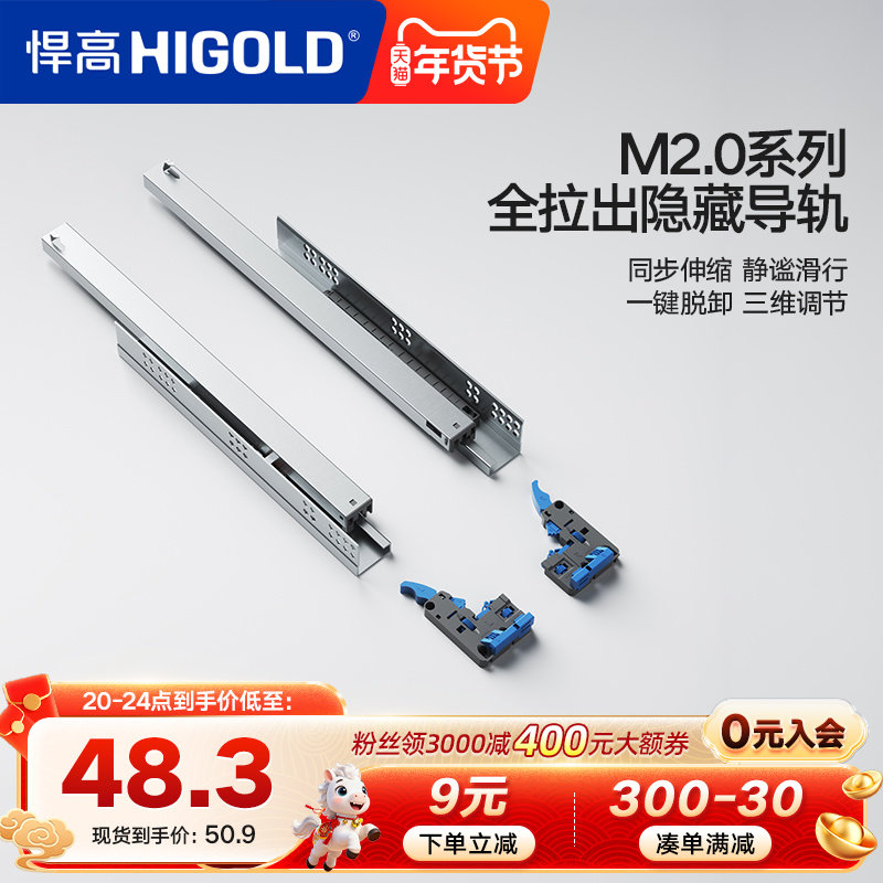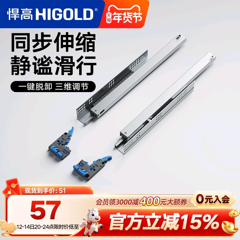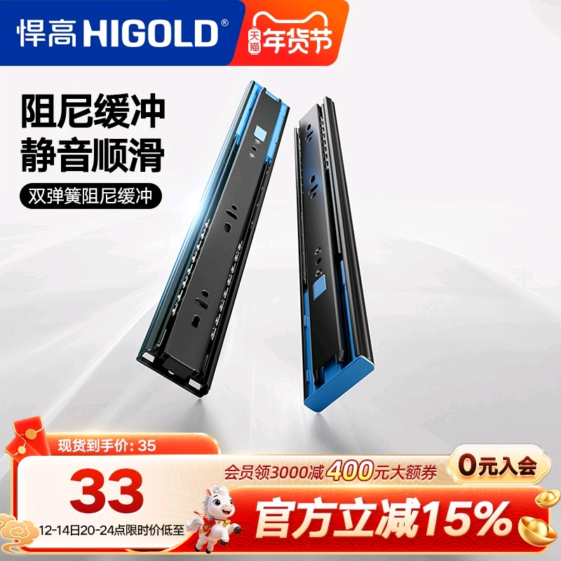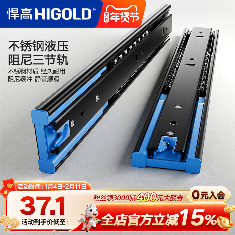 HIGOLD/悍高 抽屉轨道三节轨双弹簧阻尼缓冲静音导轨滑轨五金配件