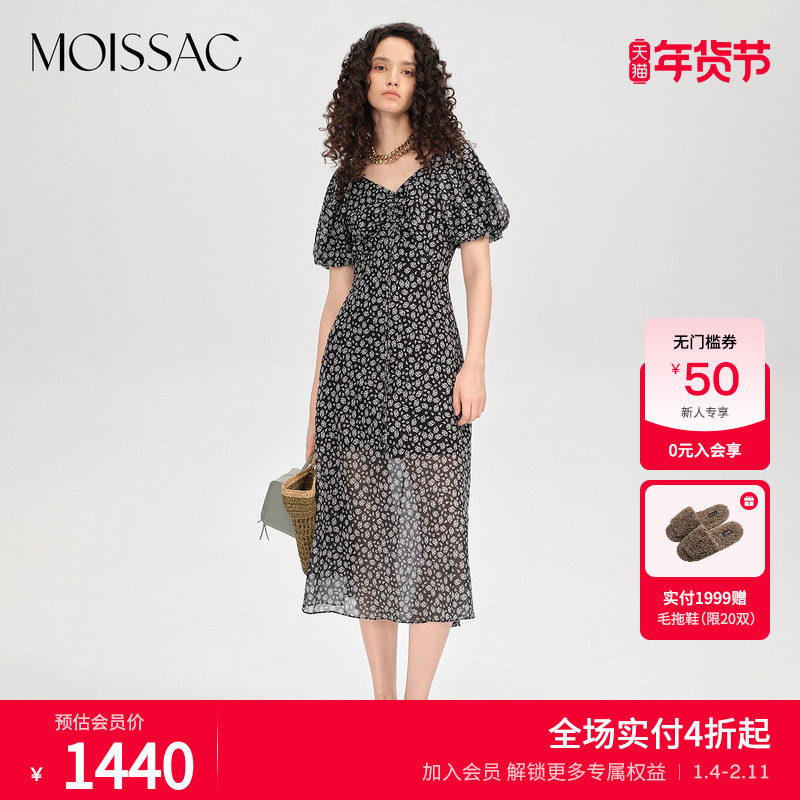 MISSCOCOON法式碎花绒感亮丝肌理V领连衣裙腰部抽褶秋款