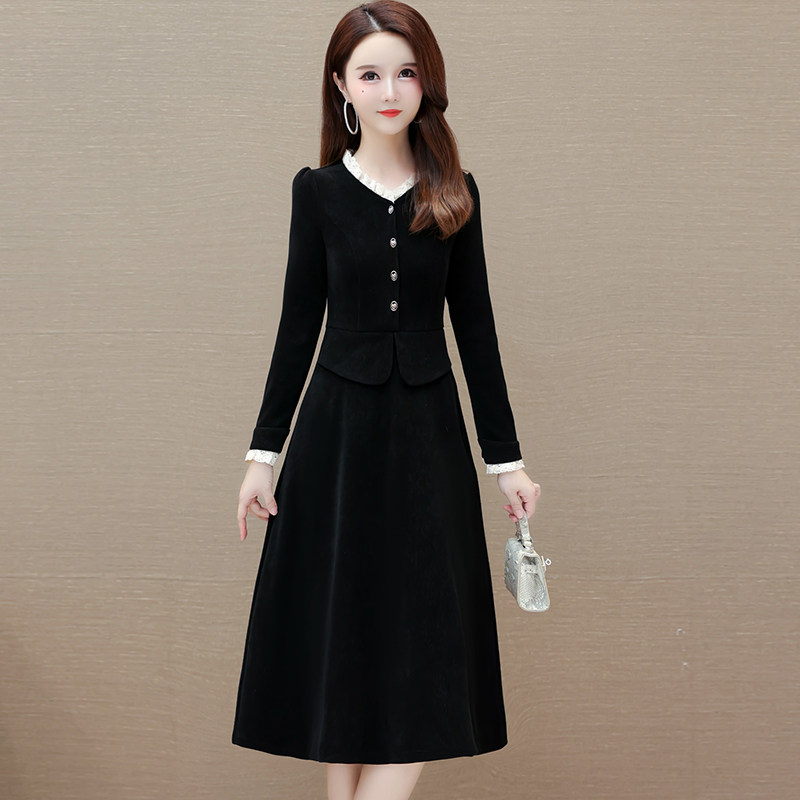 黑色秋款连衣裙女长袖高档2025秋季新款遮肚显瘦V领假两件中长裙