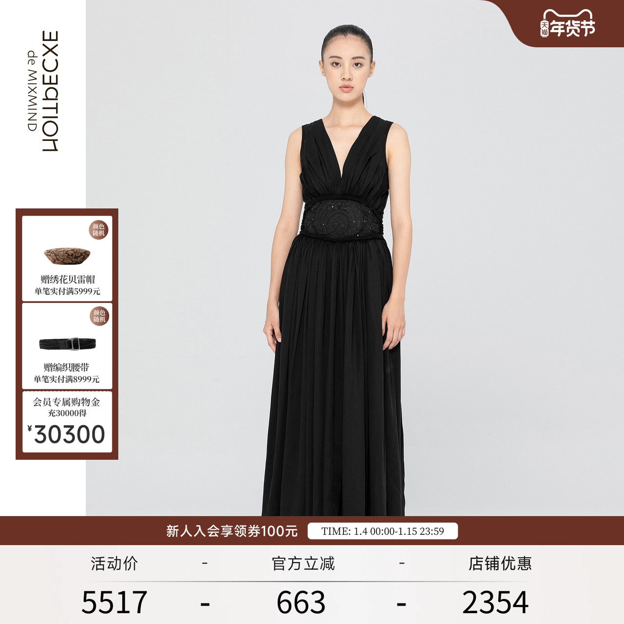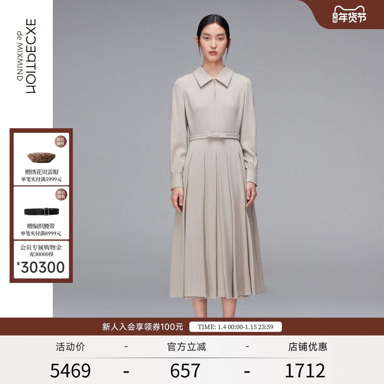 EXCEPTION例外女装春秋款羊毛百褶裙桑蚕丝V领吊带A字连衣裙