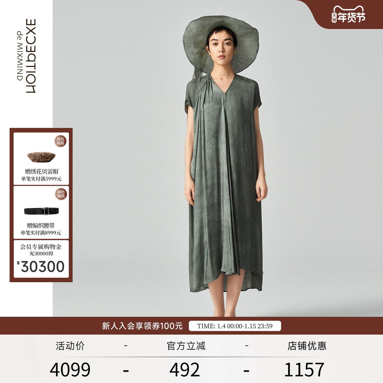 EXCEPTION例外女装春秋款不规则抽褶设计a字V领宽松连衣裙