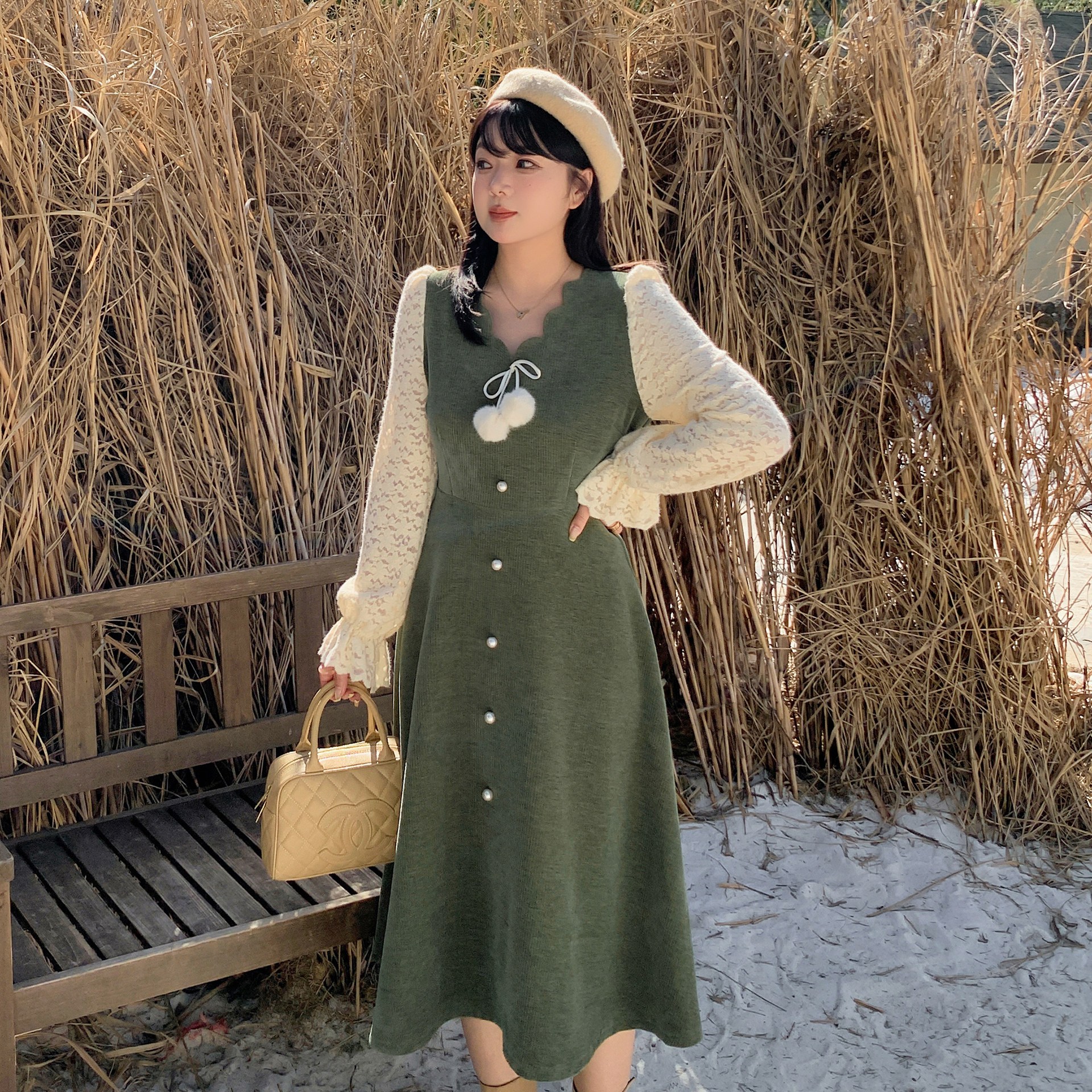 胖mm大码女装法式V领蕾丝拼接连衣裙2025秋款显瘦甜美减龄长裙女