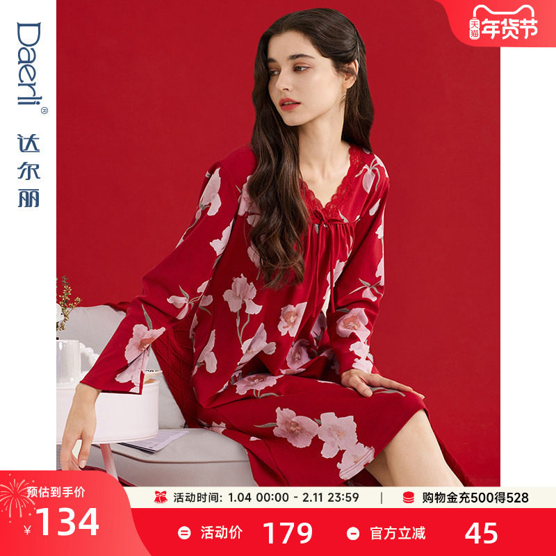 达尔丽秋款睡裙女款新款中裙蕾丝V领印花长袖中裙针织纯棉连衣裙