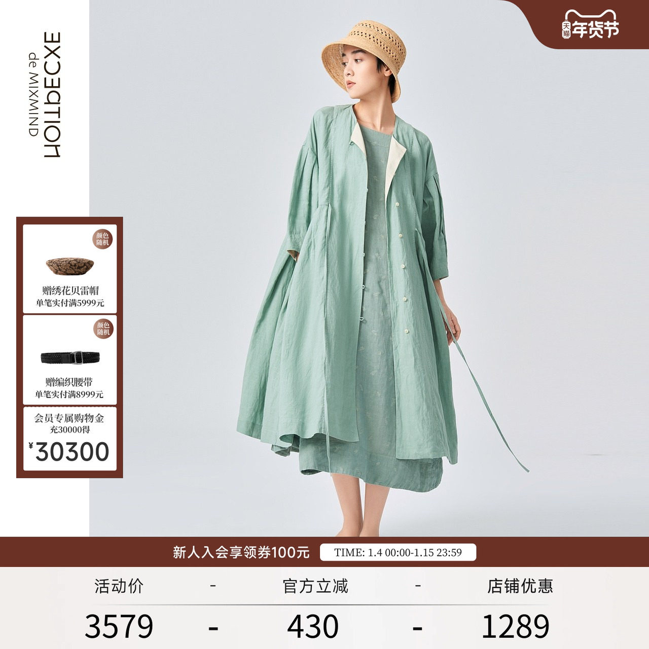 EXCEPTION例外女装春秋款棉麻V领抽绳收腰气质显瘦连衣裙