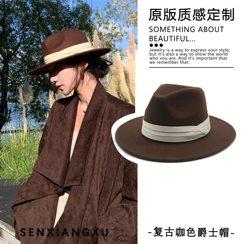 纯色爵士帽纯色礼帽女英伦风复古羊毛帽毛呢帽毡帽出游逛街短檐潮