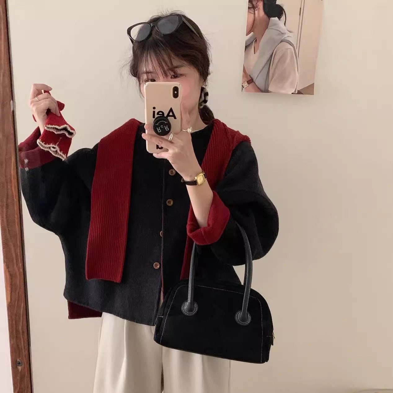 黑色无领短款双面绵羊毛大衣女25秋新款宽松时尚简约气质毛呢外套