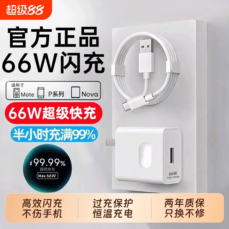【官方正品】适用华为66充电器头Mate60pro/50荣耀40超级闪充Nova8/7/9/10手机数据线100原套装120插头