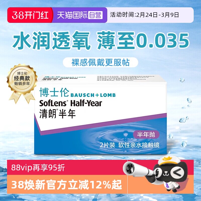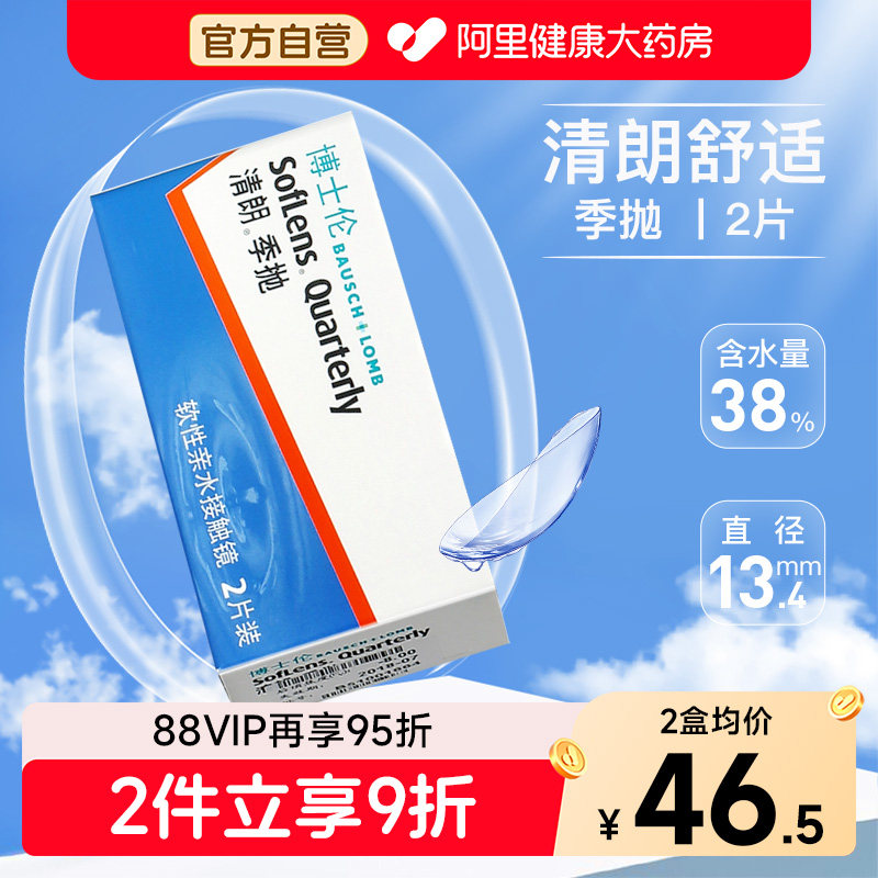 博士伦清朗季抛2片水润舒适隐形近视眼镜盒非半年抛透明白片正品