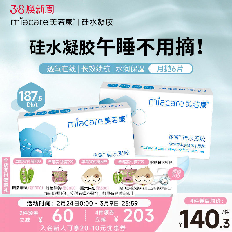 美若康硅水凝胶月抛隐形近视眼镜盒透明6片高度数高透氧官方正品