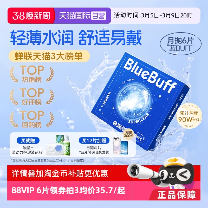 【自营】海昌蓝buff隐形近视眼镜月抛盒6片水凝胶透明正品水润