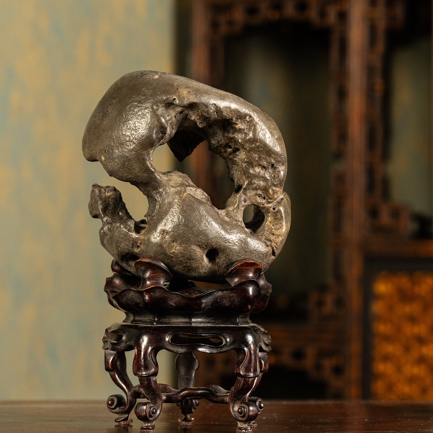 清代 灵璧石文房赏石(红木座)古董文玩收藏天然赏石靠山石摆件