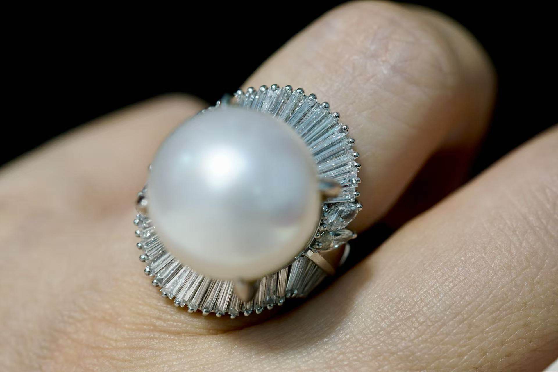 2万多亏本卖2克拉多钻石16mm鸽子蛋大澳白海水珍珠钻石戒指Pt铂金