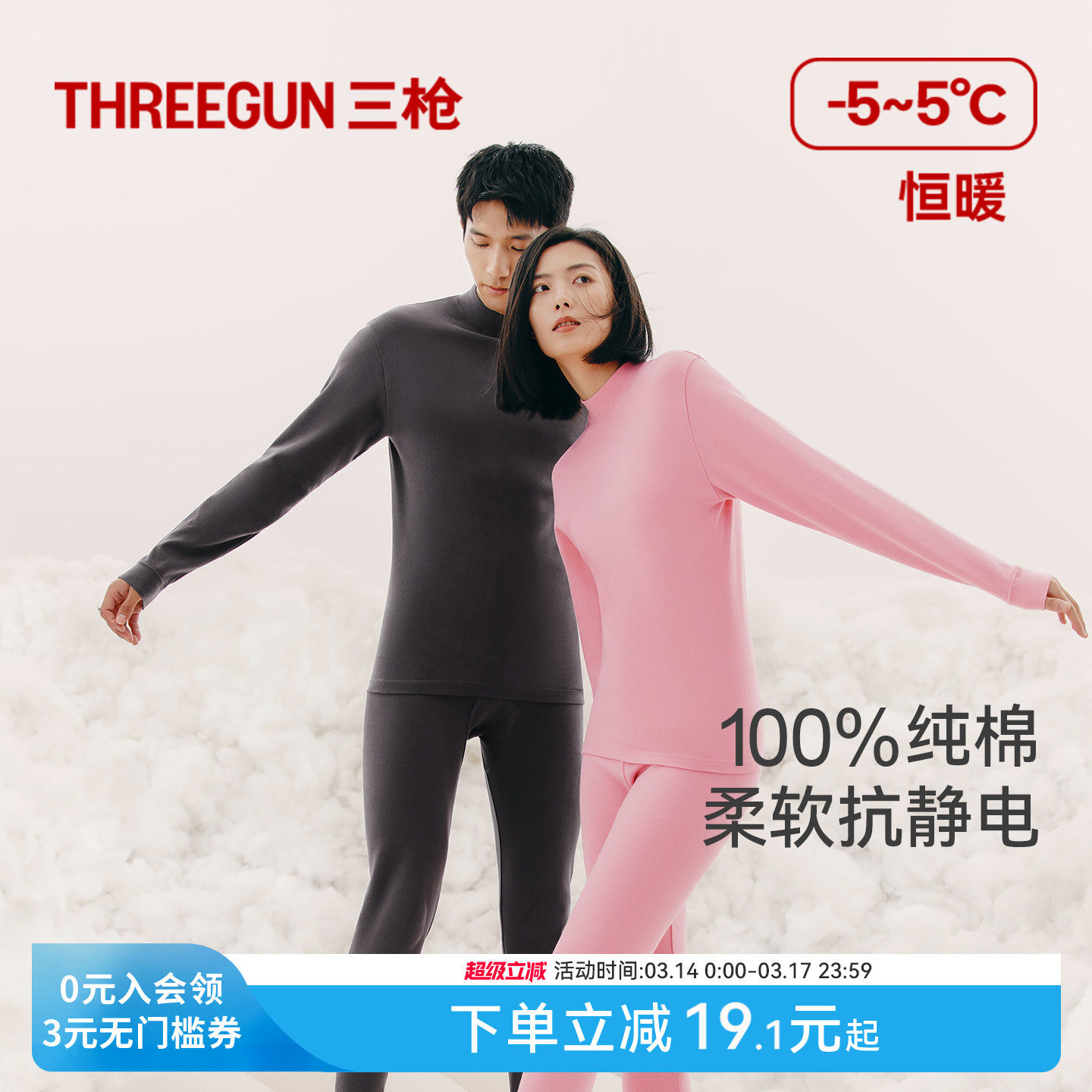 三枪保暖内衣女纯棉抗静电圆领秋衣秋裤男半高领无侧缝100%全棉