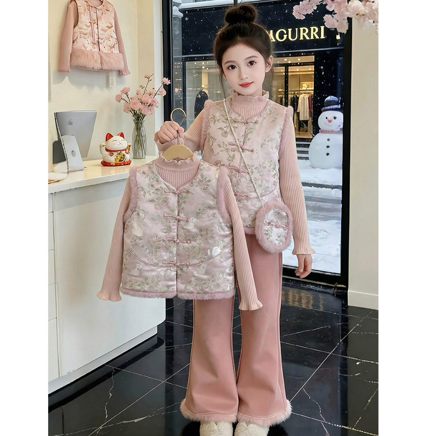 女童套装2026新款冬装儿童汉服洋气国风中式加厚马甲小女孩三件套