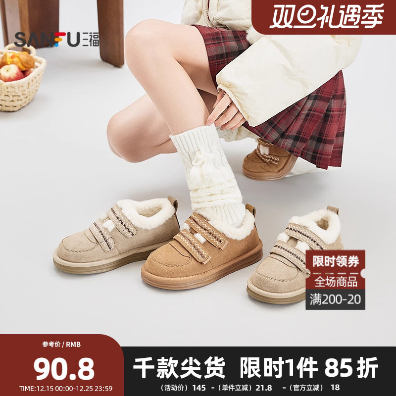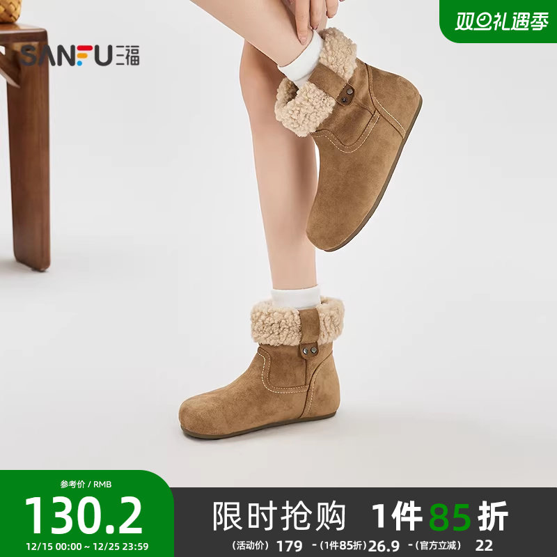 三福女毛毛鞋冬季复古毛绒短靴时尚保暖薄底雪地靴女鞋850078