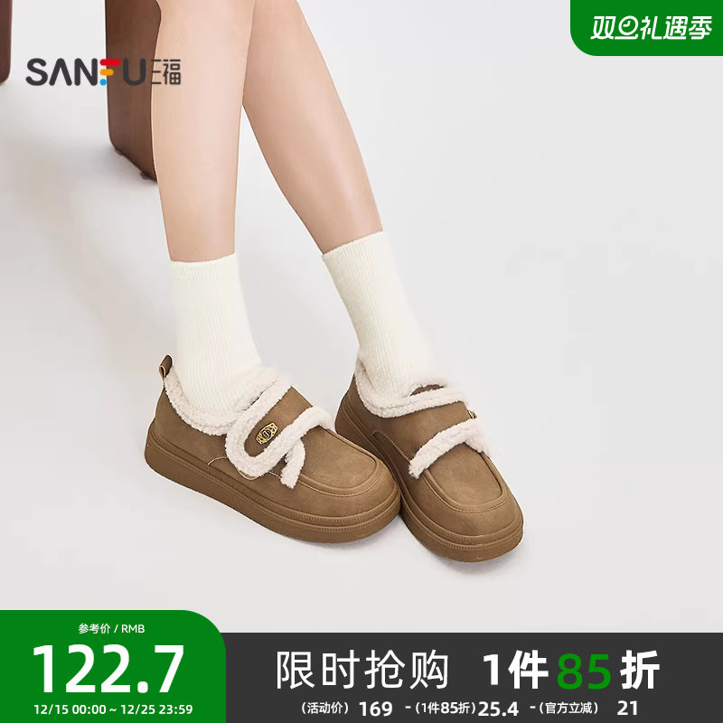 三福女毛毛鞋冬季韩系复古风一条带毛边圆头保暖女鞋851402