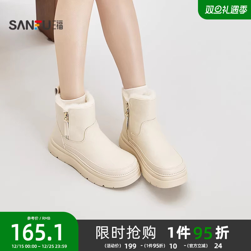 三福女毛毛鞋冬季经典重塑侧边拉链保暖雪地靴短靴女鞋852145