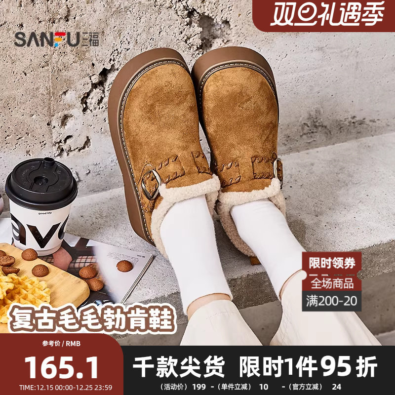 三福女毛毛鞋冬季童趣韩系复古风金属扣厚底勃肯鞋女鞋848352