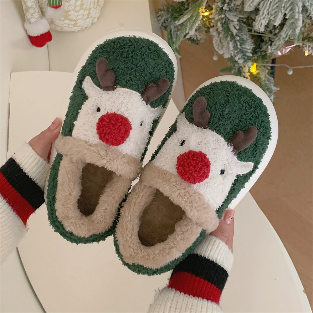 情侣休闲居家防滑全包跟毛毛鞋冬季卡通红鼻子圣诞麋鹿棉拖鞋男女