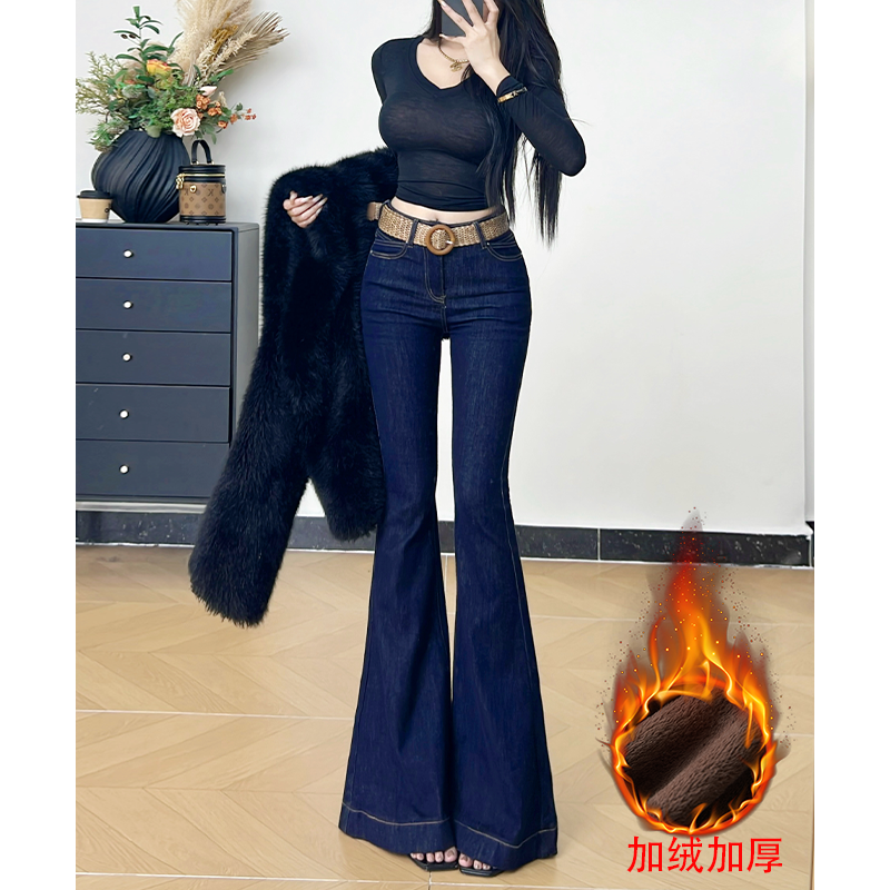 大阔腿修身牛仔裤女2025秋冬季加绒加厚新款小个子提臀鱼尾喇叭裤