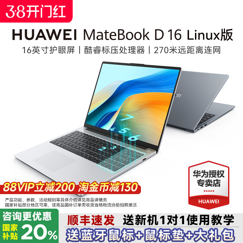 【国家补贴20%】华为MateBook D16 Linux版新品笔记本电脑13代酷睿标压学生学习商务办公轻薄本官方旗舰正品