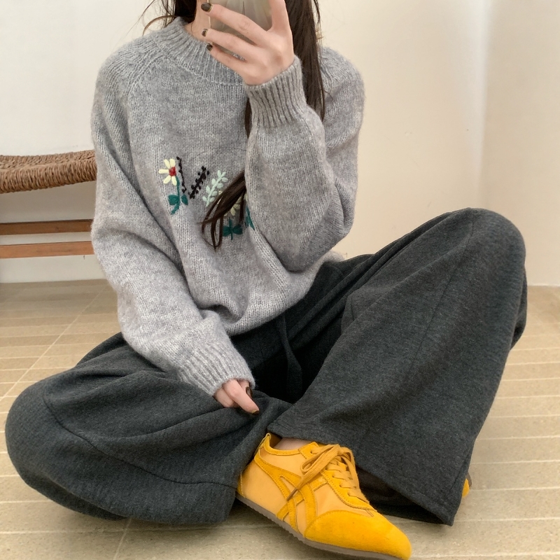 此外 圆领基础版刺绣套头毛衣女2025冬季新款宽松韩版加厚针织衫