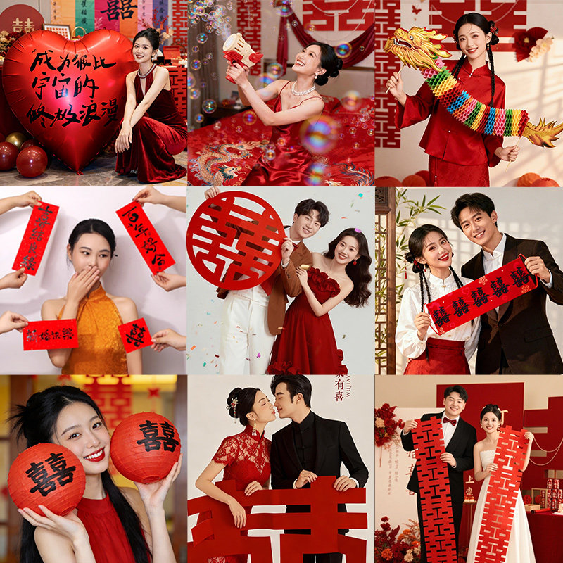 结婚晨袍拍照道具婚礼接亲游戏创意摆拍神器灯笼氛围对联喜字拍摄