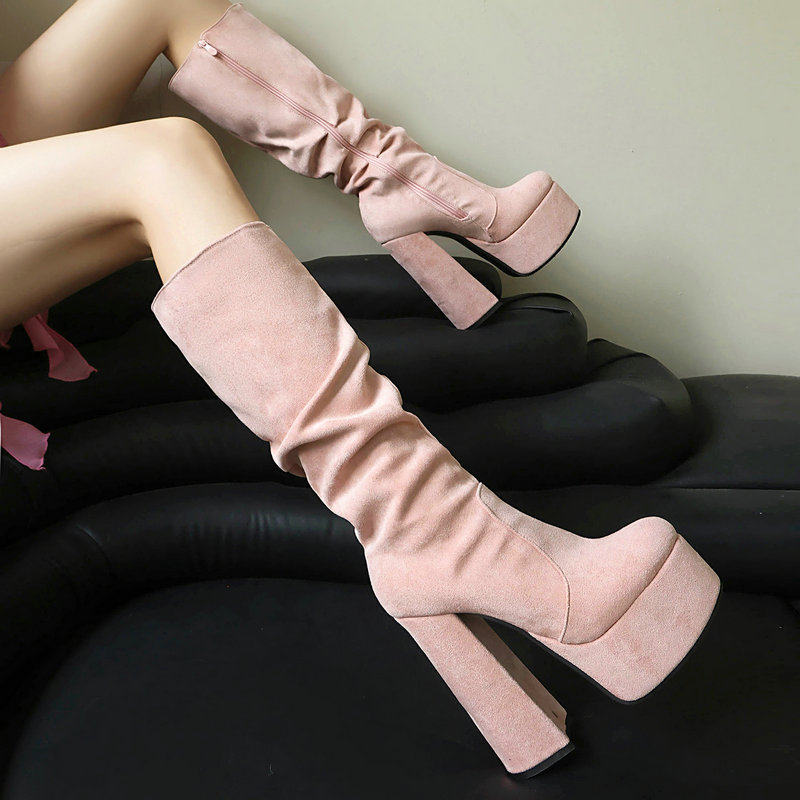 15厘米超高跟鞋恨天高粗跟高筒不过膝长靴绒面褶皱网红辣妹演出鞋
