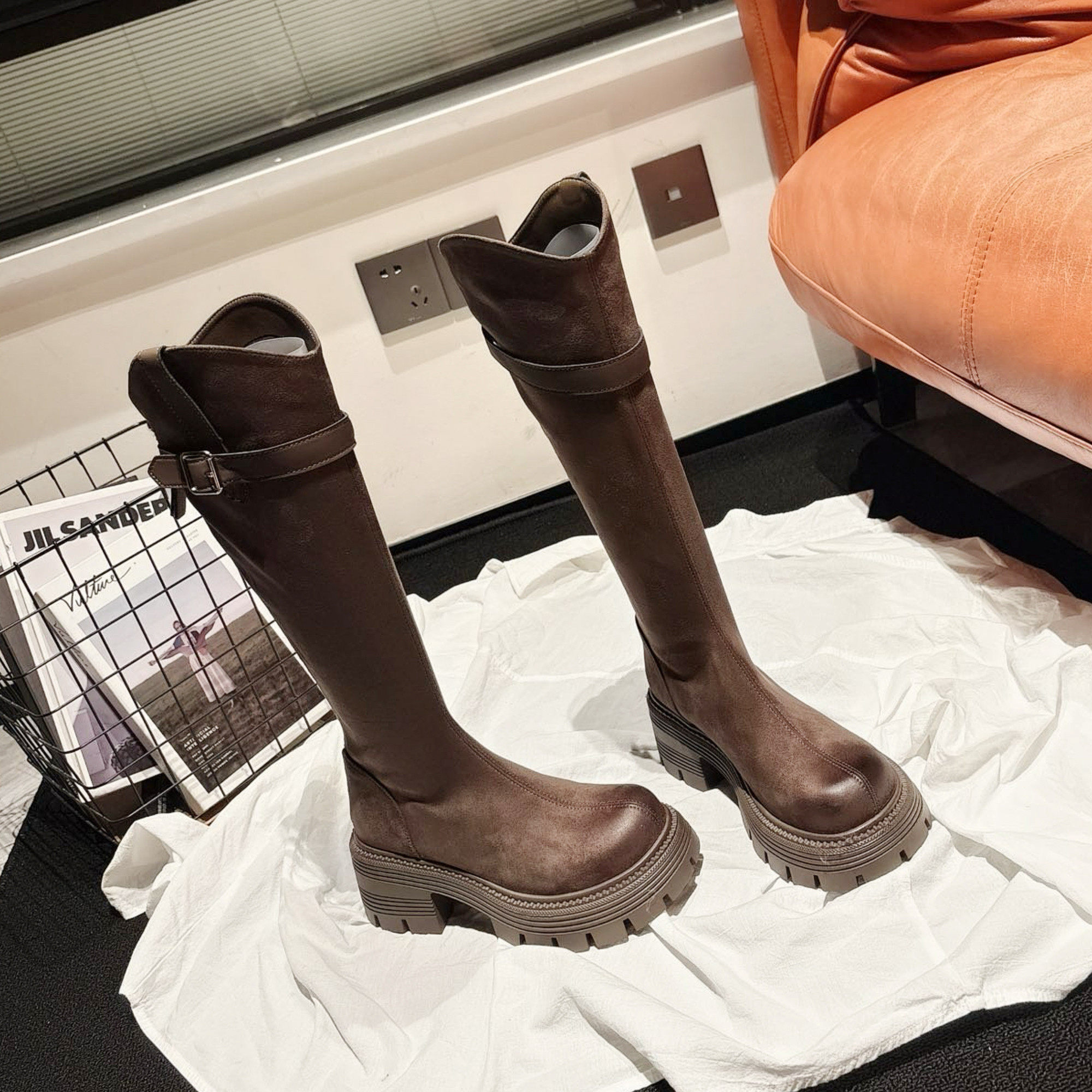 超软~擦色粗高跟皮带扣长筒靴女2025秋冬新款高筒靴ins瘦瘦靴长靴