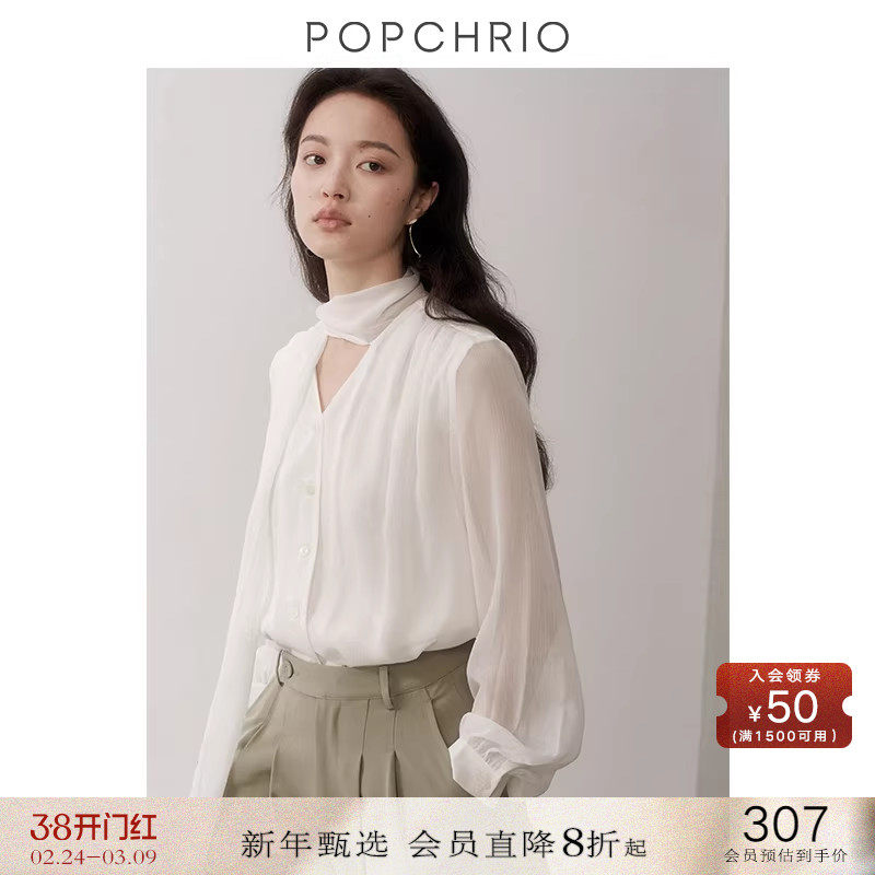 POPCHRIO欧可芮◆法式V领抽褶飘带衬衫雪纺泡泡长袖微透衬衣上衣