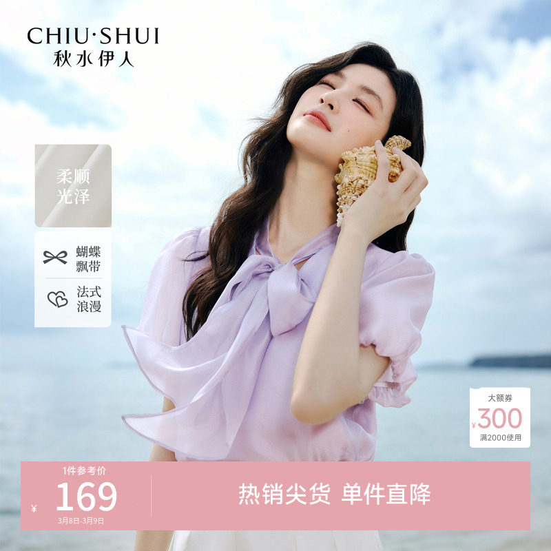 秋水伊人粉色雪纺衫女2026年春季新款领口木耳边优雅飘带衬衫上衣