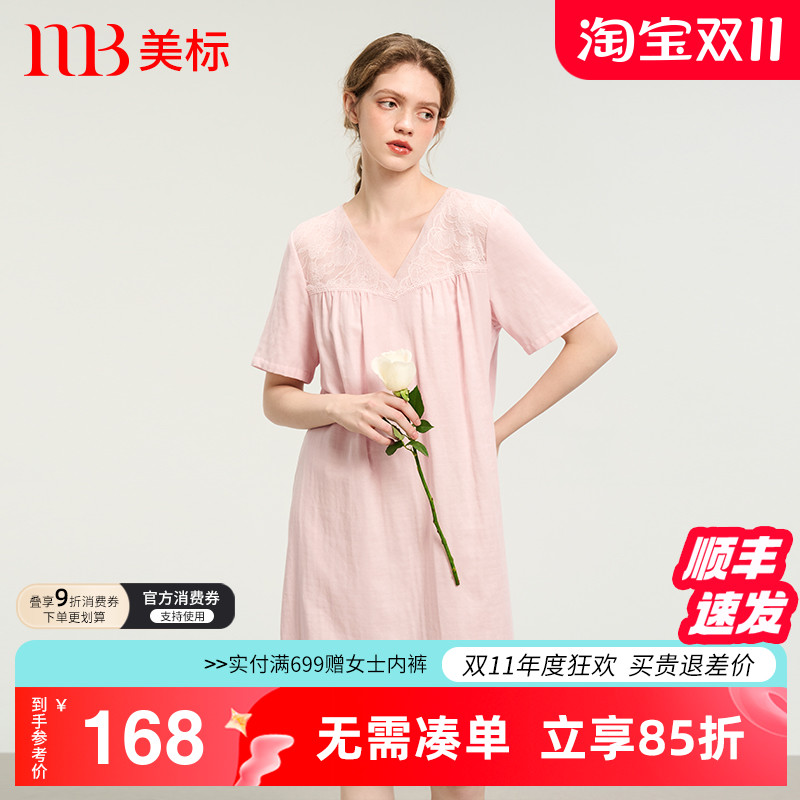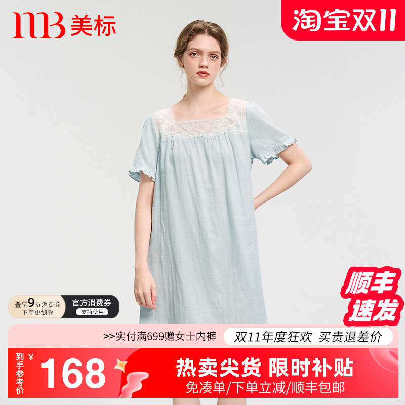 美标新款短袖纯棉睡裙女夏薄款双层棉纱全棉可外穿睡衣蕾丝家居服