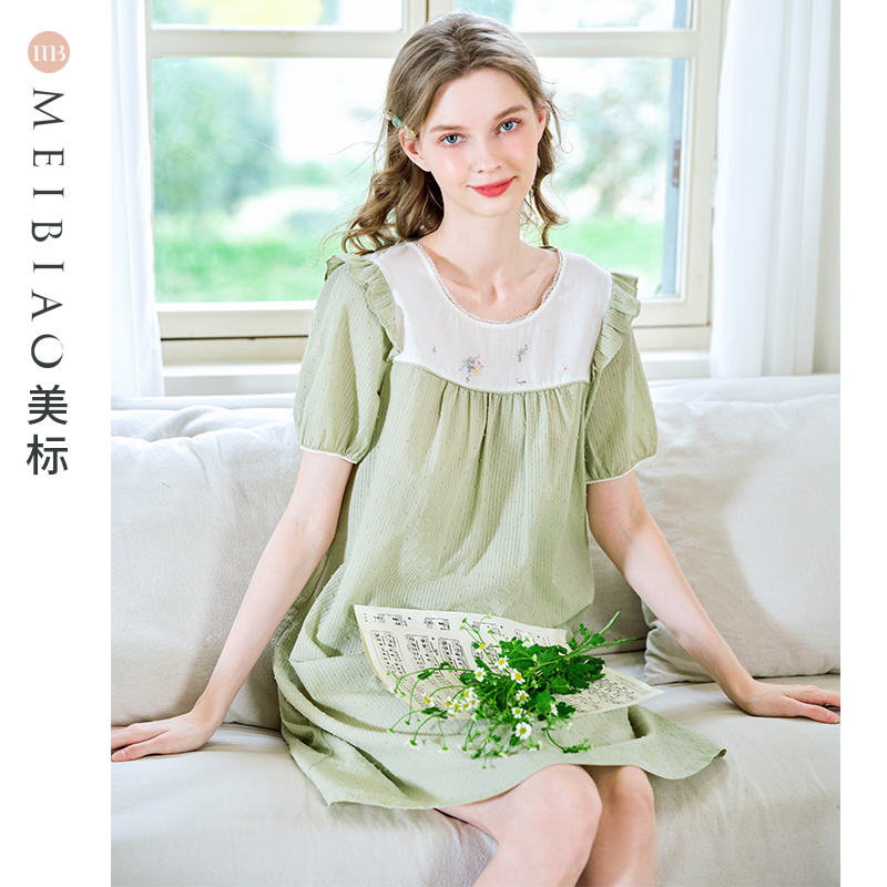 美标新款短袖纯棉睡裙女夏全棉薄款双层棉纱睡衣甜美可外穿家居服