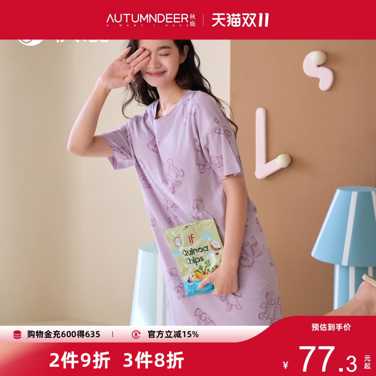 秋鹿【售完不补】短袖纯棉睡裙女夏季可外穿可爱卡通少女风居家服