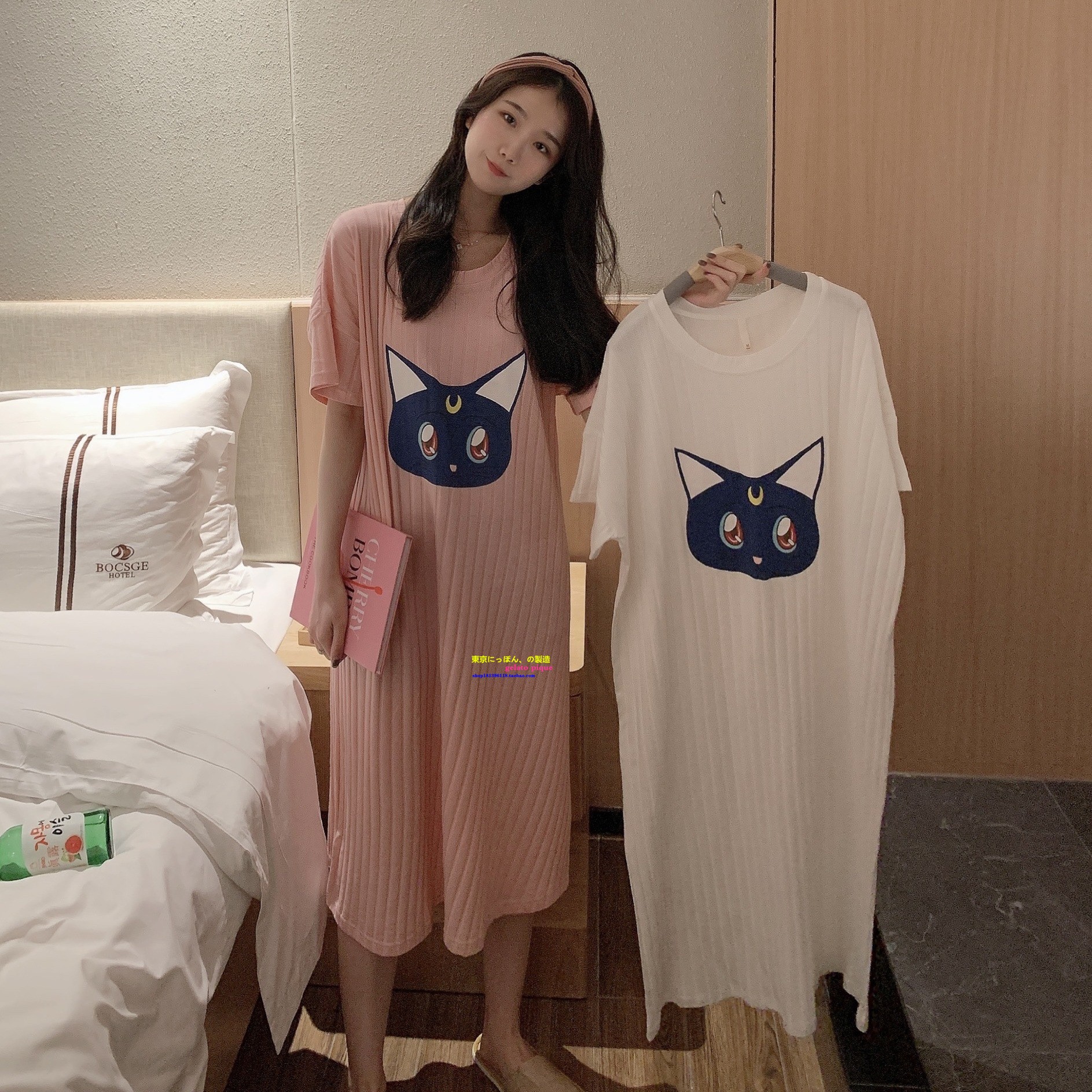 正品GP pique夏季睡衣女卡通露娜猫咪短袖纯棉睡裙可爱家居服长裙
