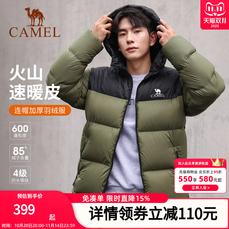 骆驼男装防泼水面包服男秋冬连帽加厚保暖鸭绒短款拒水羽绒服外套