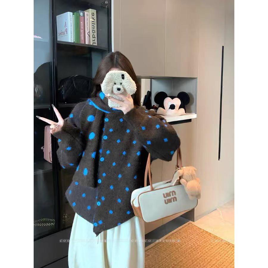 芝士奶油黄miu系波点圆领毛衣外套女秋冬月光蓝显白温柔针织开衫