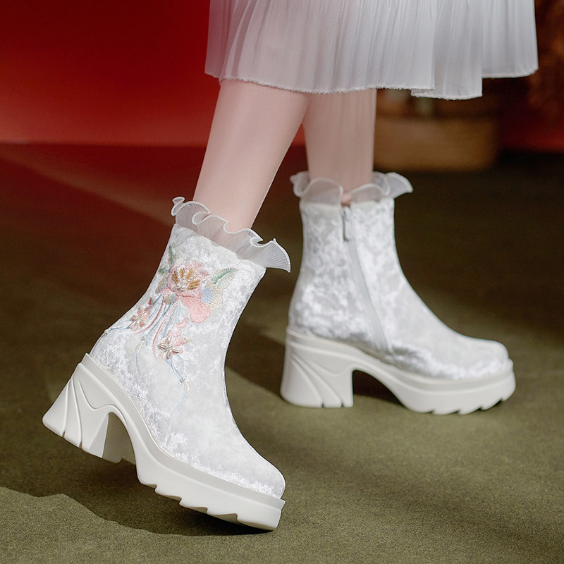 2025秋冬新款汉服鞋靴子女短靴民族风秋冬加绒刺绣花靴厚底松糕底