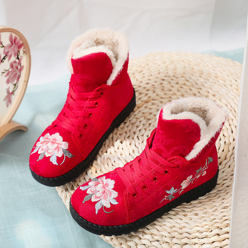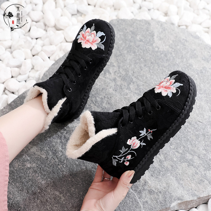 绣花靴子女冬季加绒保暖棉鞋民族风时尚款舒适软底老北京汉服布鞋