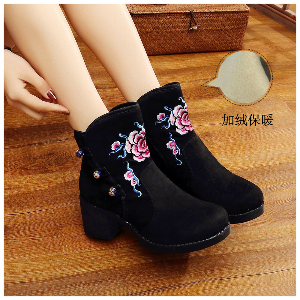 秋冬老北京布鞋粗跟棉靴加绒民族风绣花靴拉链短靴高跟加厚女靴子