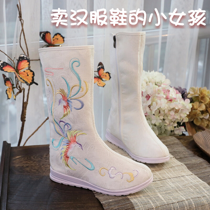 秋冬新款长筒汉服靴子古风绣花靴子内增高筒雪地靴加棉保暖棉靴女