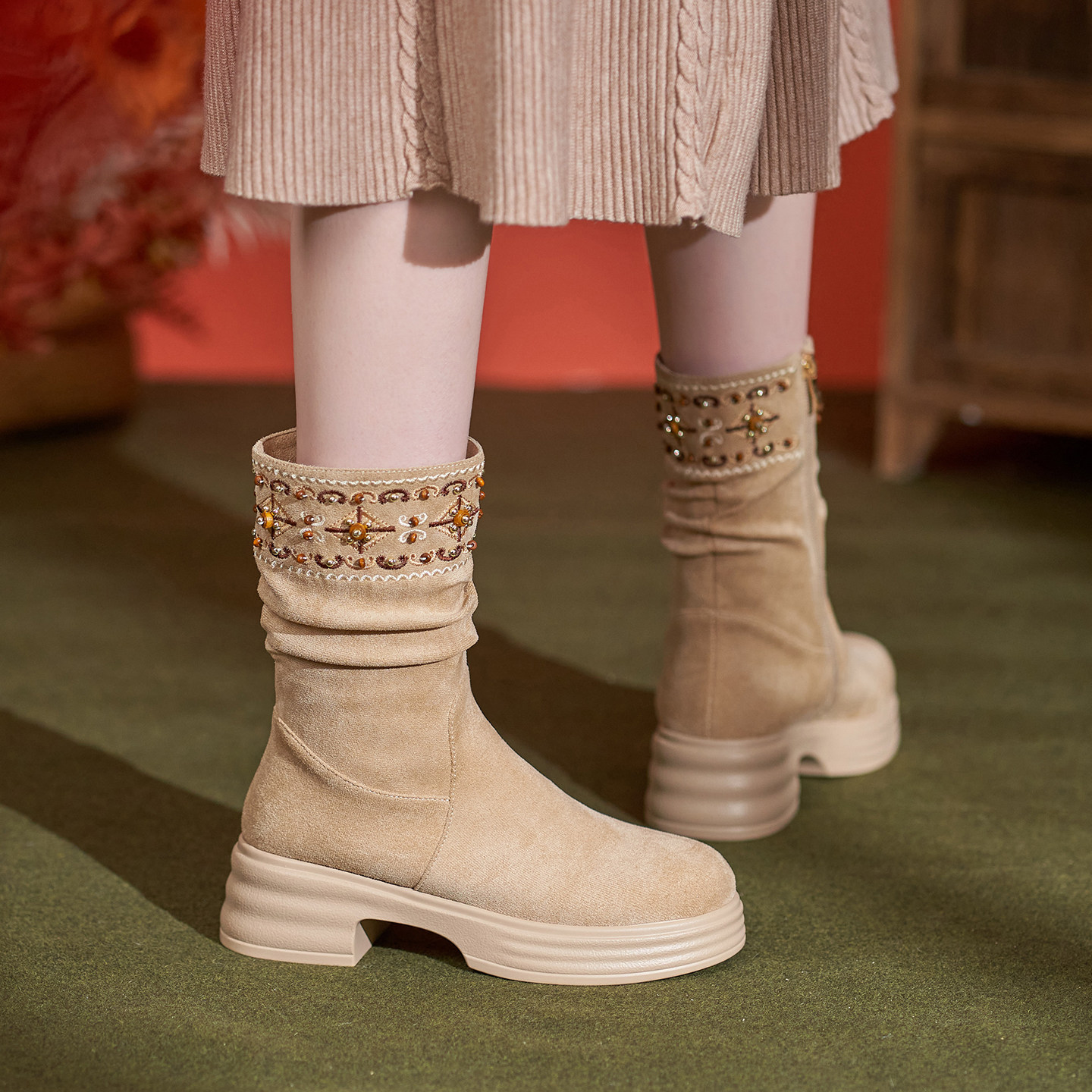新中式靴美拉德风中筒靴堆堆靴厚底冬季加绒棉鞋民族风刺绣花靴女